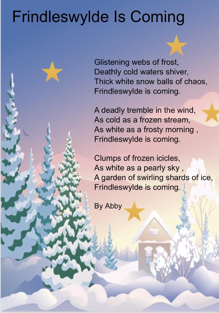 English: we have thoroughly enjoyed reading *Frindleswylde* by Natalia and Lauren O'Hara, and wrote some wonderful poetry, which we then transformed into creative pieces during a computing session.